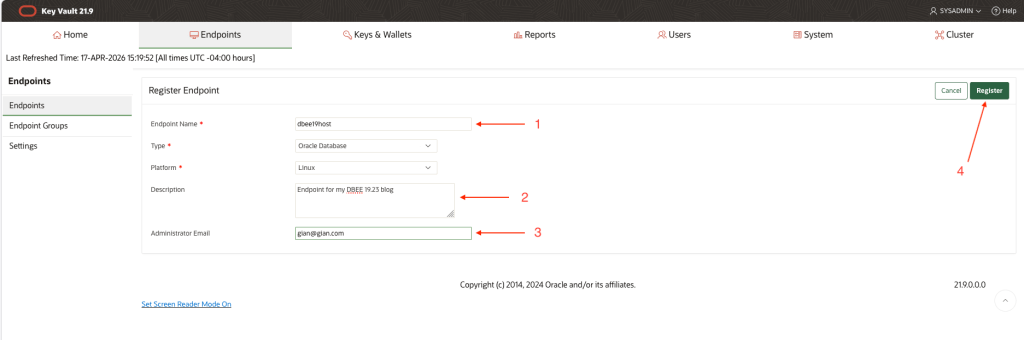 On the Add Endpoint page, enter a Name, Description and Admin email address. The latter two are optional. Click Register.