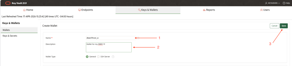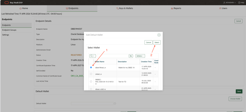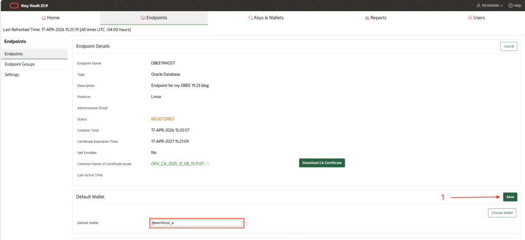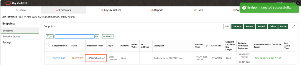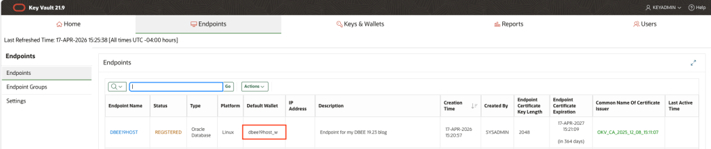 [oracle@dbee19host bin]$ ./okvutil listEnter Oracle Key Vault endpoint password:Unique ID Type Identifier23579273-E95E-49CD-930F-D91FBAA4A247 Opaque Object TDE Wallet Metadata2739B595-7603-58ED-B664-F4299776E0B7 Symmetric Key TDE Master Encryption Key: MKID AfwxDePjcU+Jv5MAThtLvaUAAAAAAAAAAA5E2FDC01-9FB9-4908-B645-4EB7EEAFFF6C Template Default template for DBEE19HOST855BA03E-B61A-44DC-BB30-5FC8C5CE02E9 Symmetric Key TDE Master Encryption Key: MKID 0641C031B61C334F9FBFBC9041B74F59E18CBBD09F-6626-4DCD-A7CE-7394AFE938F4 Opaque Object TDE Wallet MetadataB3E2BB6B-7A32-4382-BF05-E9A9E0931795 Secret Data Oracle Secret Data: ID OKV_PASSWORDC1DC9C3F-2867-49FE-95C3-99876F27CEE7 Opaque Object Certificate RequestE68B275B-CFF7-413E-9A3F-0DF9D8FF1358 Opaque Object TDE Wallet MetadataEECB0DEE-5DC3-4D98-B60C-B731C39F782E Private Key -F358DF59-2E20-40D9-98E8-6B4439979BD8 Opaque Object TDE Wallet MetadataF42A11AB-E238-4E35-9D5C-0322B194BBC3 Symmetric Key TDE Master Encryption Key: MKID 0654EDDCC3DB8B4FB1BFE80A1711533784FE17DABB-04EA-5CA1-90B8-EFE720E63D23 Symmetric Key TDE Master Encryption Key: MKID AcCbGigSwU8Cv9oo9gtw5HQAAAAAAAAAAA[oracle@dbee19host bin]$ sqlplus sys@orclpdb as sysdbaSQL*Plus: Release 19.0.0.0.0 - Production on Fri Apr 17 20:14:14 2026Version 19.23.0.0.0Copyright (c) 1982, 2023, Oracle. All rights reserved.Enter password:Connected to:Oracle Database 19c Enterprise Edition Release 19.0.0.0.0 - ProductionVersion 19.23.0.0.0sys@ORCLPDB> ADMINISTER KEY MANAGEMENT SET KEY USING TAG 'orclpdb_20260417_a' FORCE KEYSTORE IDENTIFIED BY EXTERNAL STORE container=current;keystore altered.sys@ORCLPDB> quitDisconnected from Oracle Database 19c Enterprise Edition Release 19.0.0.0.0 - ProductionVersion 19.23.0.0.0[oracle@dbee19host bin]$ ./okvutil listEnter Oracle Key Vault endpoint password:Unique ID Type Identifier23579273-E95E-49CD-930F-D91FBAA4A247 Opaque Object TDE Wallet Metadata2739B595-7603-58ED-B664-F4299776E0B7 Symmetric Key TDE Master Encryption Key: MKID AfwxDePjcU+Jv5MAThtLvaUAAAAAAAAAAA5E2FDC01-9FB9-4908-B645-4EB7EEAFFF6C Template Default template for DBEE19HOST855BA03E-B61A-44DC-BB30-5FC8C5CE02E9 Symmetric Key TDE Master Encryption Key: MKID 0641C031B61C334F9FBFBC9041B74F59E18CBBD09F-6626-4DCD-A7CE-7394AFE938F4 Opaque Object TDE Wallet MetadataAAA1652B-2B5A-4663-8410-95883A5D6E32 Symmetric Key TDE Master Encryption Key: TAG orclpdb_20260417_aB3E2BB6B-7A32-4382-BF05-E9A9E0931795 Secret Data Oracle Secret Data: ID OKV_PASSWORDC1DC9C3F-2867-49FE-95C3-99876F27CEE7 Opaque Object Certificate RequestE68B275B-CFF7-413E-9A3F-0DF9D8FF1358 Opaque Object TDE Wallet MetadataEECB0DEE-5DC3-4D98-B60C-B731C39F782E Private Key -F358DF59-2E20-40D9-98E8-6B4439979BD8 Opaque Object TDE Wallet MetadataF42A11AB-E238-4E35-9D5C-0322B194BBC3 Symmetric Key TDE Master Encryption Key: MKID 0654EDDCC3DB8B4FB1BFE80A1711533784FE17DABB-04EA-5CA1-90B8-EFE720E63D23 Symmetric Key TDE Master Encryption Key: MKID AcCbGigSwU8Cv9oo9gtw5HQAAAAAAAAAAA