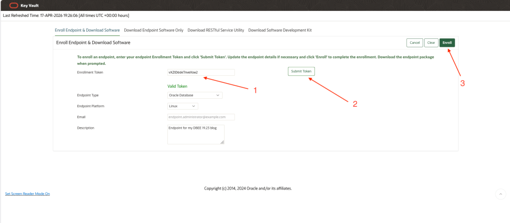 In the next sequence of steps, you will use the Enrollment Token you saved earlier to Enroll your Endpoint and Download the Endpoint software which will be installed on your database server. This Endpoint Enrollment package (okvclient.jar) is unique for each endpoint. The package contains TLS certificates which encrypt traffic between database server and OKV server and the same certs are used to identify the specific Endpoint.